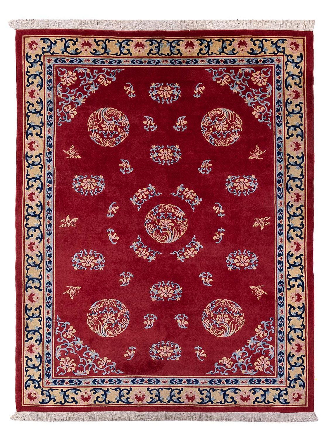 Pynt dine egne fire vegger med Kina-teppet! Dette fortryllende eksemplet på det beste kinesiske håndverket er mykt og lett å rengjøre. Tradisjonen med teppeveving går tusenvis av år tilbake i Kina, så det er ikke overraskende at disse teppene fortsatt er så populære i dag. Designet er stilig, dekorert med blomstermønstre, fugler, drager og andre motiver fra porselensmaleri. Håndknyttede Kina-tepper er av høy kvalitet og veldig fine, så de fremkaller garantert en hjemmekoselig følelse under føttene.