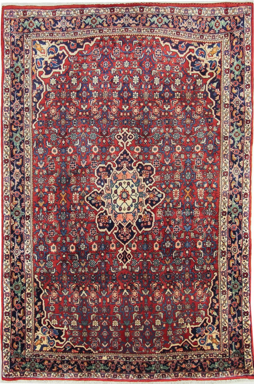 Dette Hosseinabad-tæppe er af den bedste kvalitet. Rustik charme, varme naturtoner i indigo blå og rød og særlig holdbarhed er kendetegnende for Hosseinabad-tæpper. Håndspundet iransk højlandsuld fra Iran giver det en blød glans. Den "tyrkiske knude" giver den robuste overflade. Hosseinabads anses for at være det enkleste persiske tæppe. De er traditionelt håndknyttet i landsbyerne omkring den iranske by Hamedan. Hvert tæppe er et fantasifuldt individuelt stykke. Små uregelmæssigheder i mønstret viser dette.