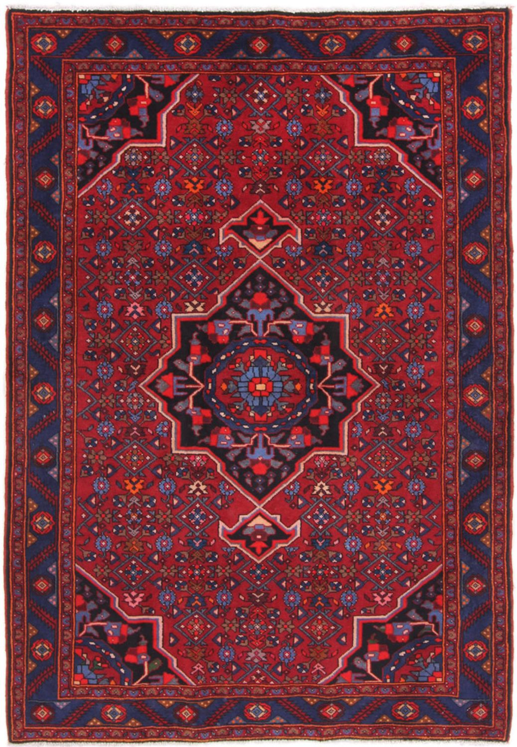 Dette Hosseinabad-tæppe er af den bedste kvalitet. Rustik charme, varme naturtoner i indigo blå og rød og særlig holdbarhed er kendetegnende for Hosseinabad-tæpper. Håndspundet iransk højlandsuld fra Iran giver det en blød glans. Den "tyrkiske knude" giver den robuste overflade. Hosseinabads anses for at være det enkleste persiske tæppe. De er traditionelt håndknyttet i landsbyerne omkring den iranske by Hamedan. Hvert tæppe er et fantasifuldt individuelt stykke. Små uregelmæssigheder i mønstret viser dette.