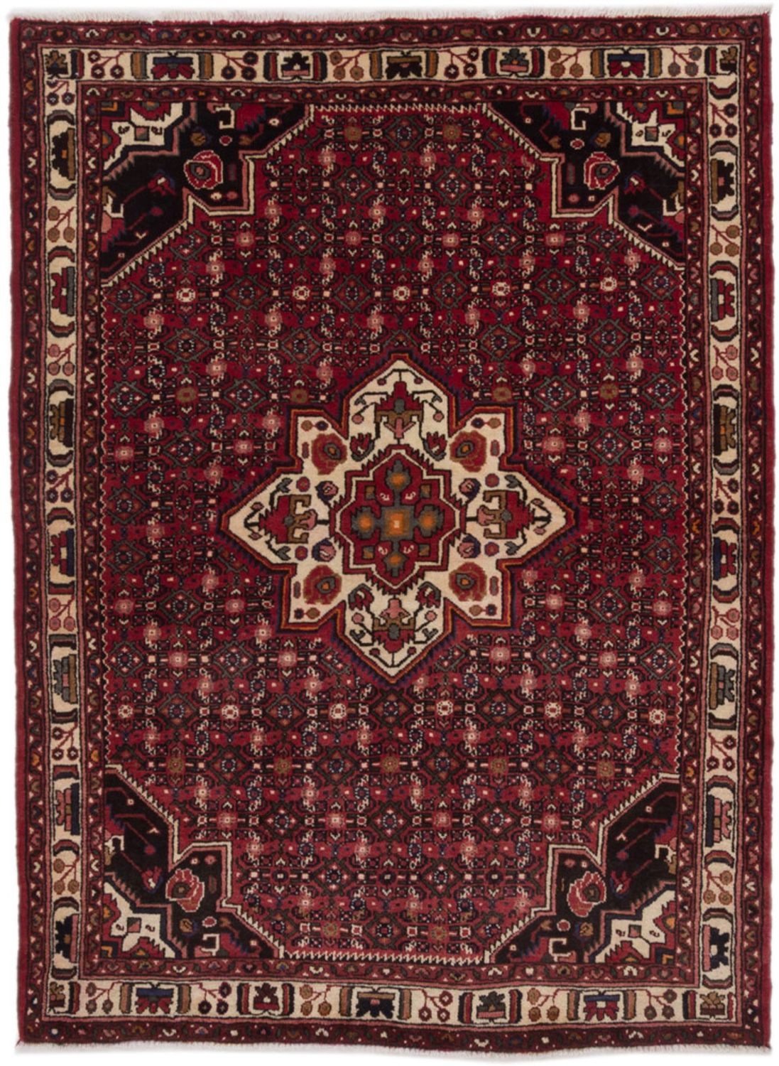 Dette Hosseinabad-tæppe er af den bedste kvalitet. Rustik charme, varme naturtoner i indigo blå og rød og særlig holdbarhed er kendetegnende for Hosseinabad-tæpper. Håndspundet iransk højlandsuld fra Iran giver det en blød glans. Den "tyrkiske knude" giver den robuste overflade. Hosseinabads anses for at være det enkleste persiske tæppe. De er traditionelt håndknyttet i landsbyerne omkring den iranske by Hamedan. Hvert tæppe er et fantasifuldt individuelt stykke. Små uregelmæssigheder i mønstret viser dette.